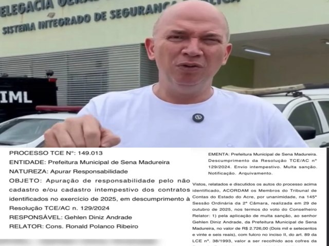 O prefeito de Sena Madureira, Gerlen Diniz (PP), foi penalizado pelo Tribunal de Contas do Estado do Acre (TCE-AC), por meio do processo nº 149.013, devido ao descumprimento de normas relacionadas à transparência na gestão de contratos públicos do município.